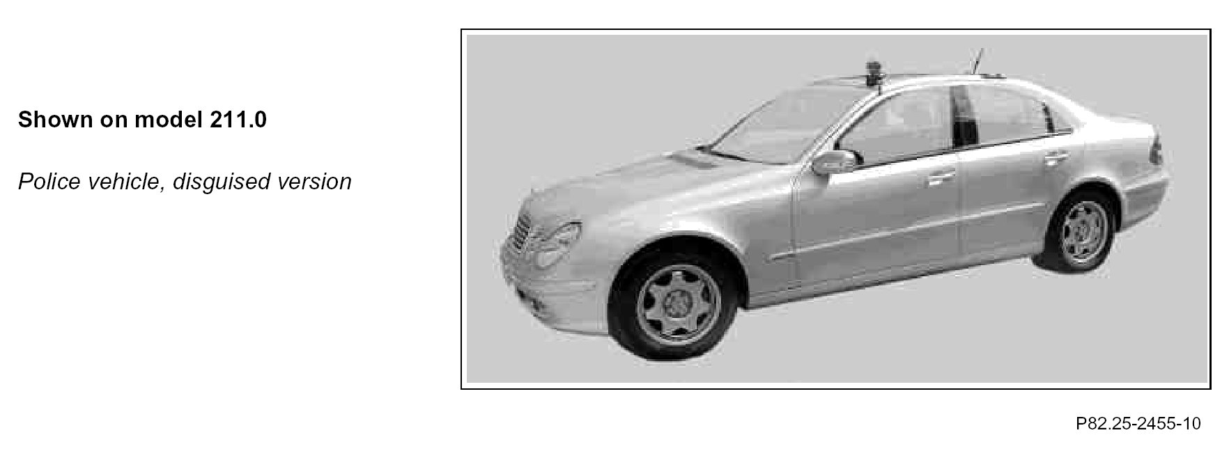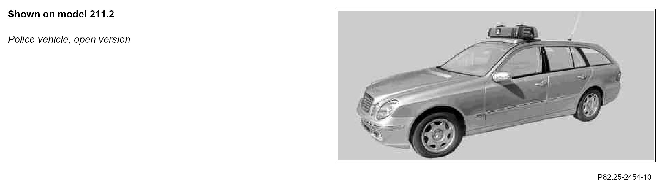 The special vehicle multifunction control unit (SVMCU [MSS]) (N26/9) recognizes through voltage of a control line from the special signal operating unit (audio and light) (A48), whether the priority vehicle warning light is switched on. With the government vehicle and disguised emergency vehicles (without special roof light bar) the special vehicle multifunction control unit (MSS) (N26/9) actuates the priority vehicle warning light.