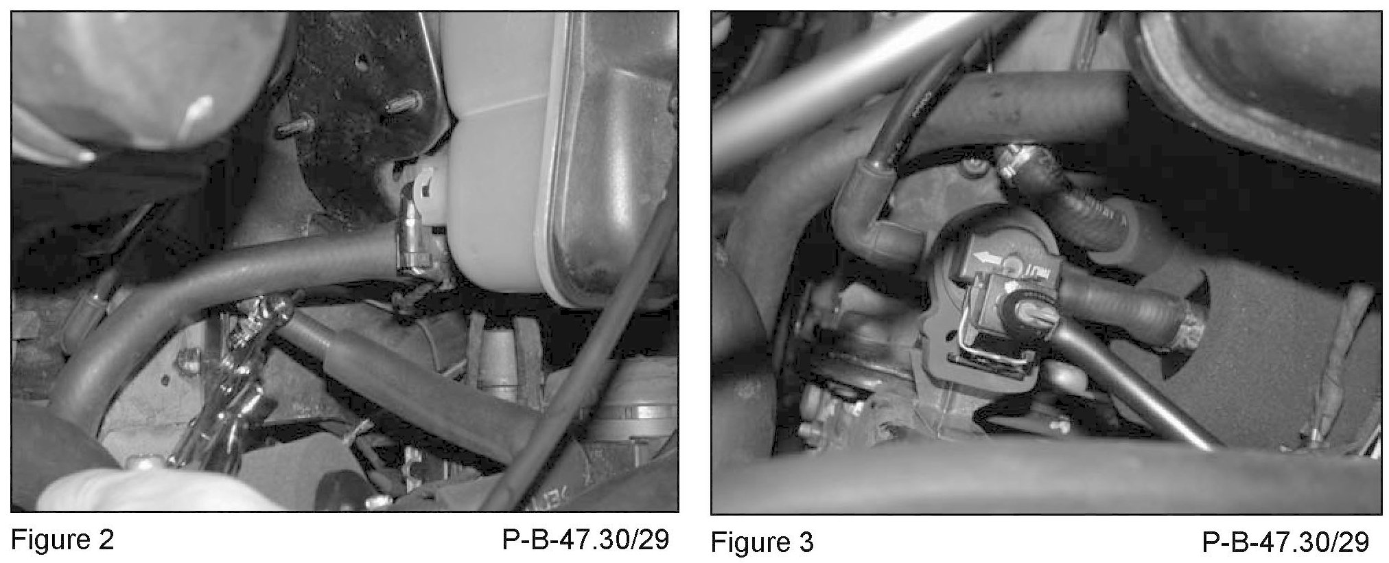 5. Install damper/purge valve assembly behind left head light assembly. Connect the purge hose to the charcoal canister and to the engine and connect electrical connector to purge valve (Figure 2 and 3).