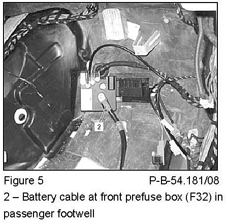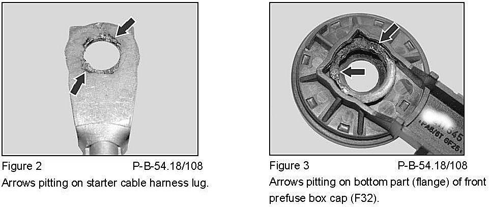 If the starter cable harness lug cannot be properly connected to the terminal point on the front prefuse box (F32) (outside part of passenger footwell), this may cause pitting of the contacts (Figure 2 & 3).
