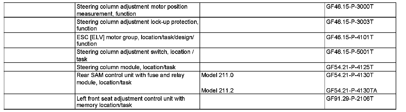 The steering column can be adjusted using the steering column adjustment switch (S59). The corresponding adjustment requests are transmitted via the Controller Area Network-Bus Class B (interior) (CAN-B). The driver-side front seat adjustment control unit with memory (N32/1) actuates the steering column adjustment motor group (M20) accordingly.