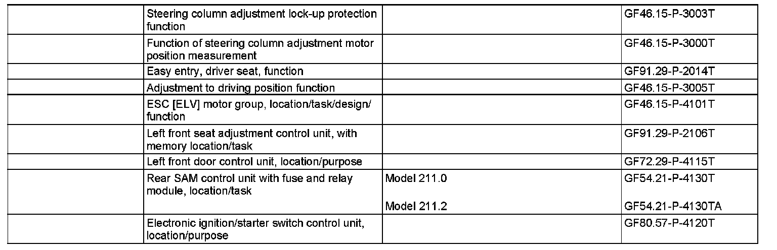 Adjustment into the entry/exit position is triggered by the above listed changes in the ignition key position and door contact states. For this the following information is read out and processed by the driver-side seat adjustment control unit with memory (N32/1) via the interior CAN: