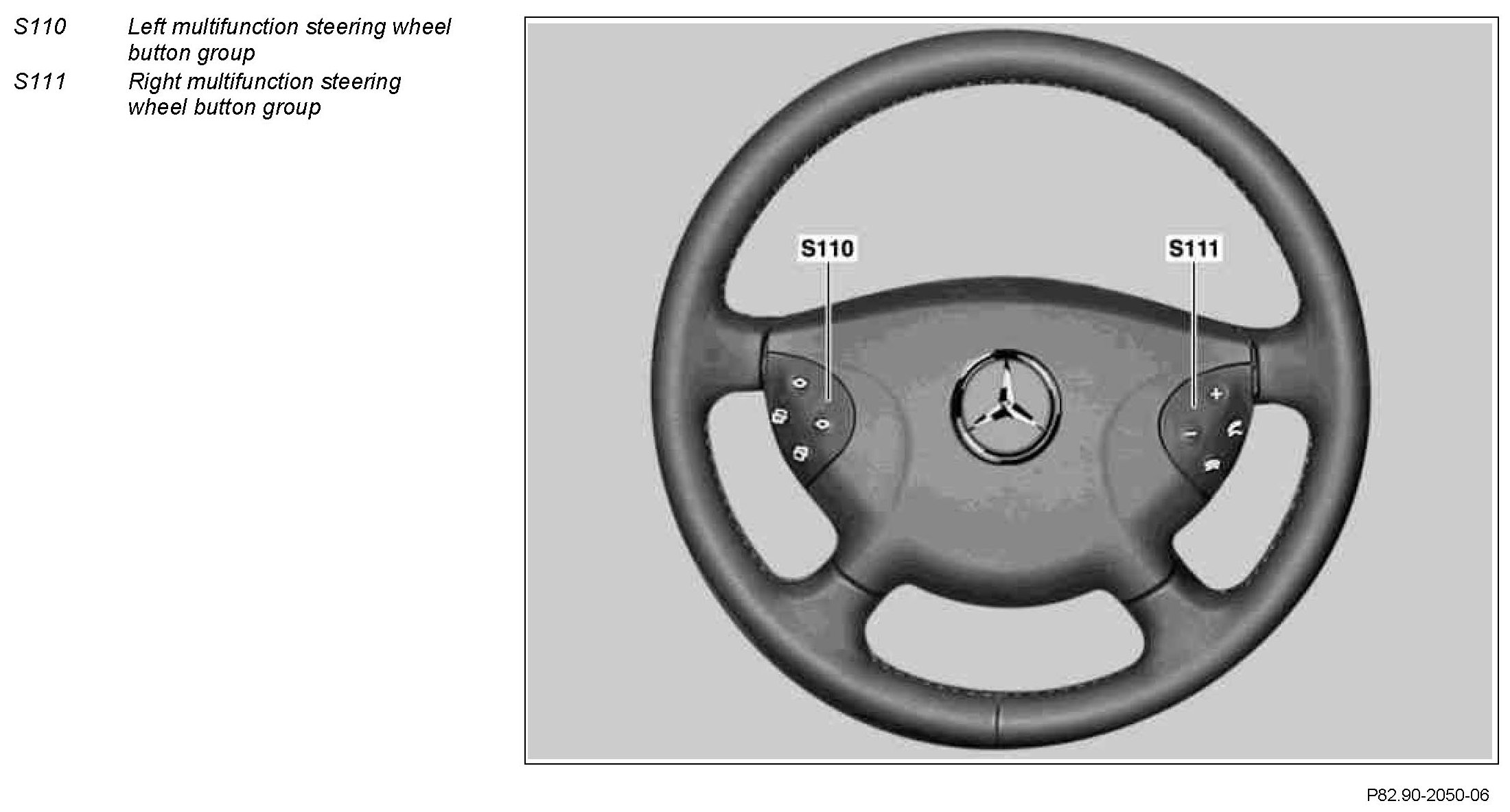 The right-hand button group for the multifunction steering wheel (S111) contains the button for accepting and terminating a telephone call (S111s3), and the + and - buttons, which are used to set specific functions and for the volume control (S111s1). A telephone call can be accepted or terminated with the accept/ terminate phone call button (S111s3).