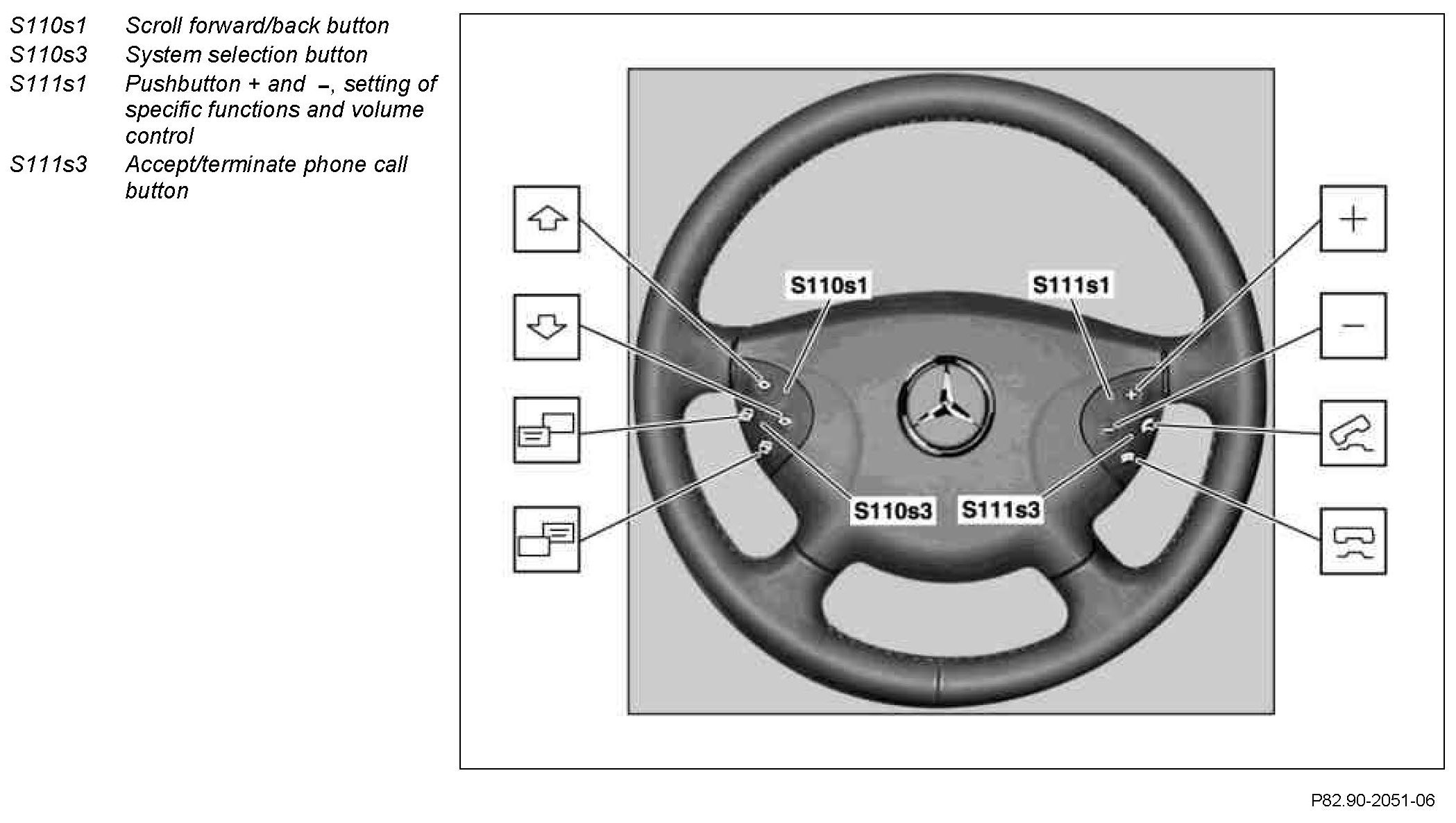 If a number of buttons is actuated simultaneously within the left multifunction steering wheel button group (S110) or right multifunction steering wheel button group (S111), only one function is activated by the instrument cluster (A1). This requires different priorities for the various functions within one button group.