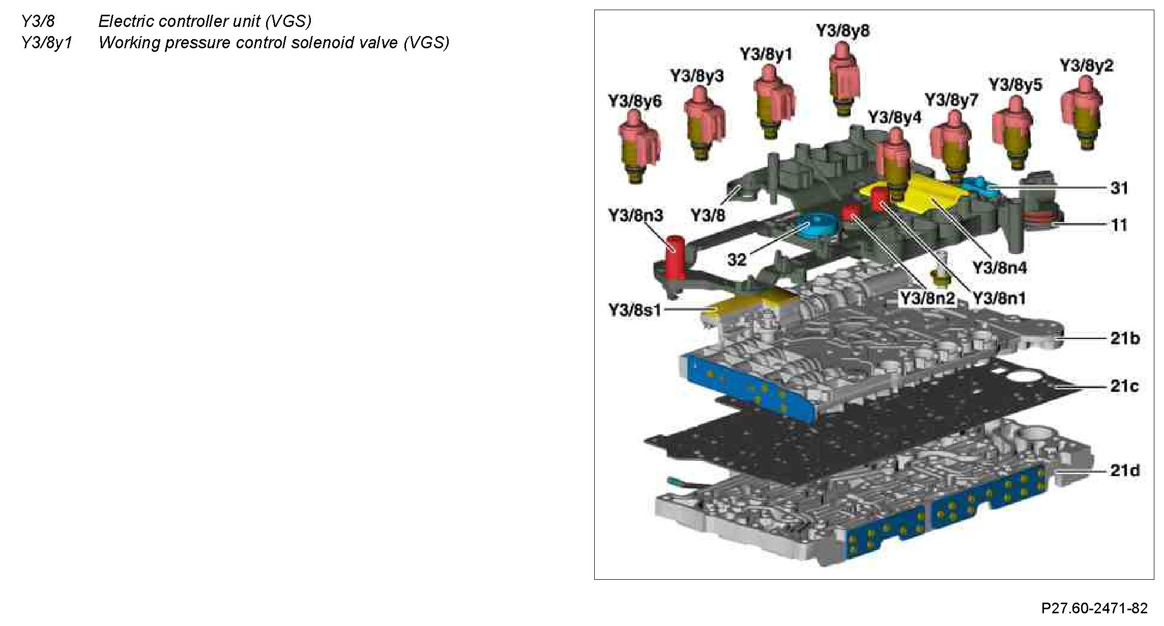 The working pressure control solenoid valve (VGS) (Y3/8y1) is actuated by the fully integrated transmission control (VGS) control unit (Y3/8n4) and influences the position of the working pressure regulating valve. The working pressure depends on the regulating valve position and thus on the geometry of the working pressure regulating valve.