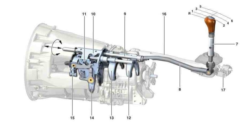 The transverse and longitudinal motions of the gearshift lever (selector and shift motions) are transmitted by the shift rod onto the main shifter shaft (9). The shift gate (11) transfers the shift operations to the corresponding shift fork (12, 13) or gearshift arm (14, 15).