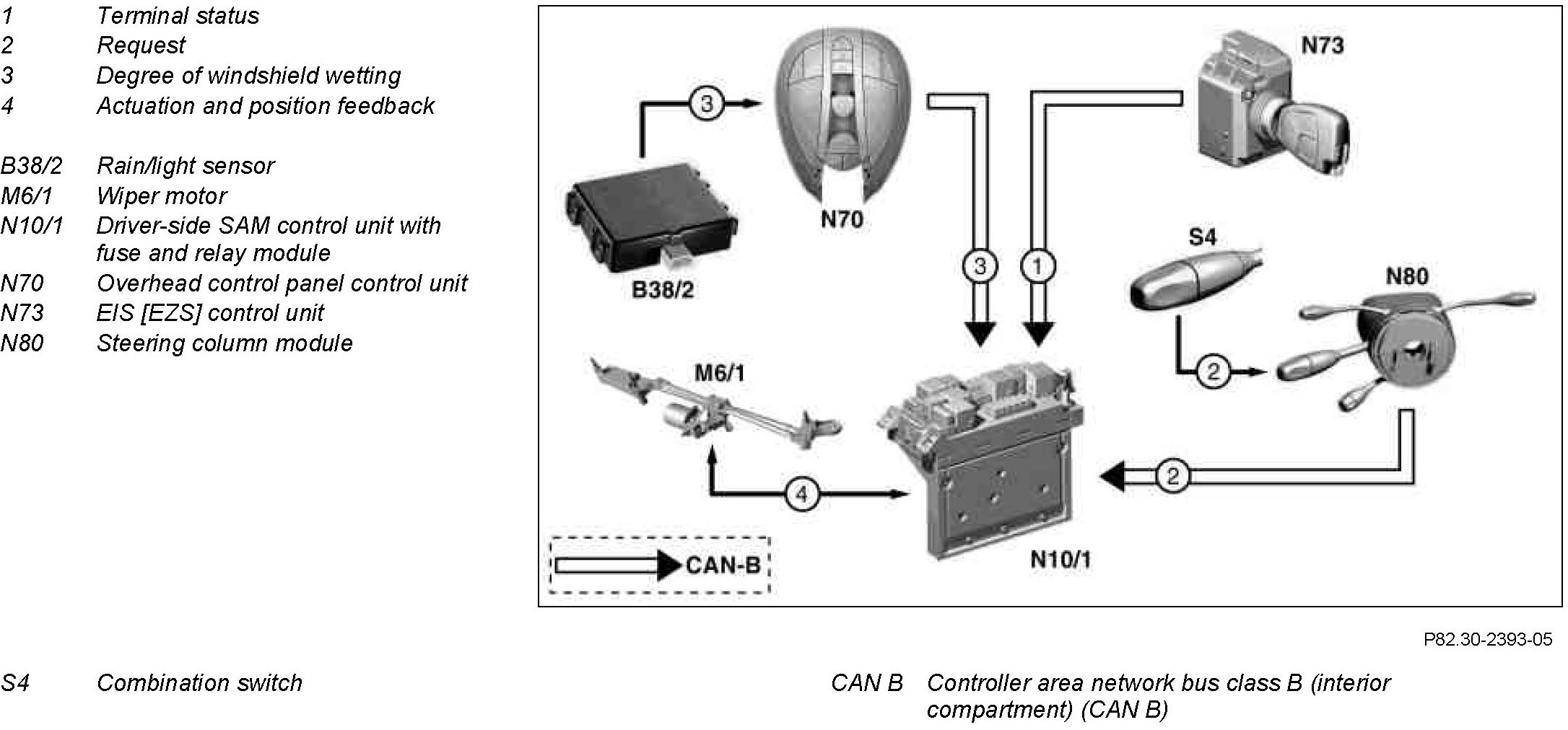 The request by the rain/light sensor is transmitted by the overhead control panel via the serial interface to the driver-side SAM control unit, which actuates the wiper motor accordingly: