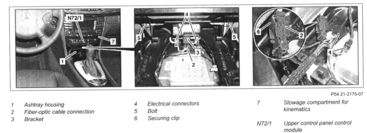 5 Pull kinematics stowage compartment (7) or CD changer from the center console until the electrical connectors (4) and optical waveguide coupling (2) are accessible