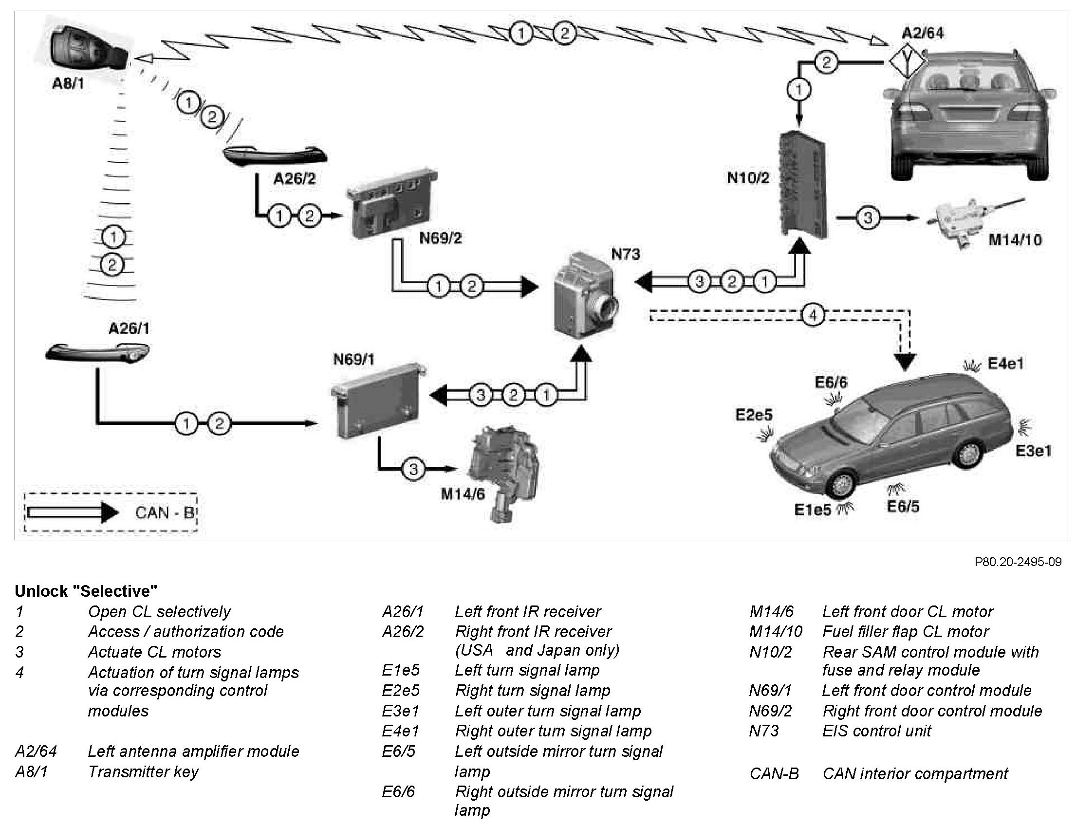 When the button "Unlock vehicle "is actuated once, the transmitter key (A8/1) transmits a signal to the corresponding receiver in the vehicle via radio and infrared signals. They receive the signal and relay it to the EIS control module (N73) via the passenger compartment CAN bus