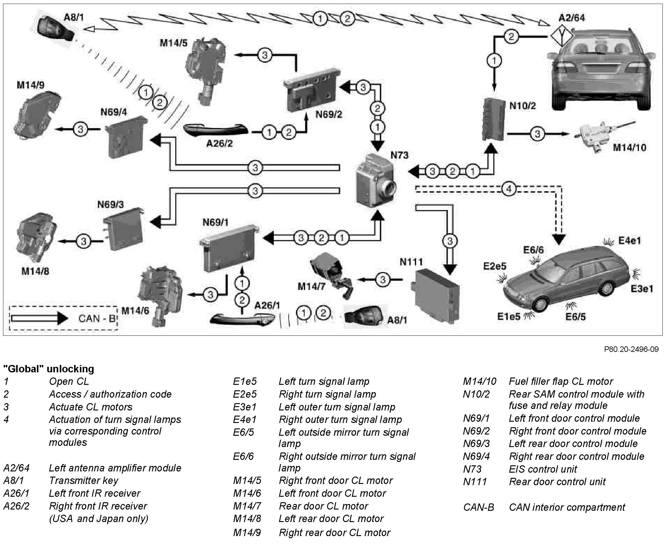 When the button "Unlock vehicle" is actuated once, the transmitter key (A8/1) sends a signal to the corresponding receiver in the vehicle via radio and infrared signals. If the access authorization is valid, the EIS control module (N73) transmits the command global unlocking to the left front door control module (N69/1), right front (N69/2), left rear (N69/3), right rear (N69/4), the rear SAM control module with fuse and relay module (N10/2) and the rear door control module (N111) via the CAN interior compartment.