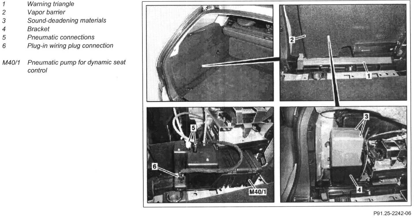 5 Remove pneumatic pump for dynamic seat control (M40/1) with the sound-deadening materials (3) upwards out of the bracket (4)