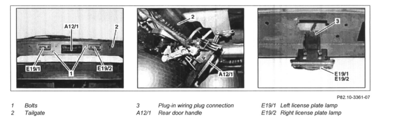 3 Unclip left license plate lamp (E 19/1) or right license plate lamp (E19/2) out of rear-end door (2) from inside to outside