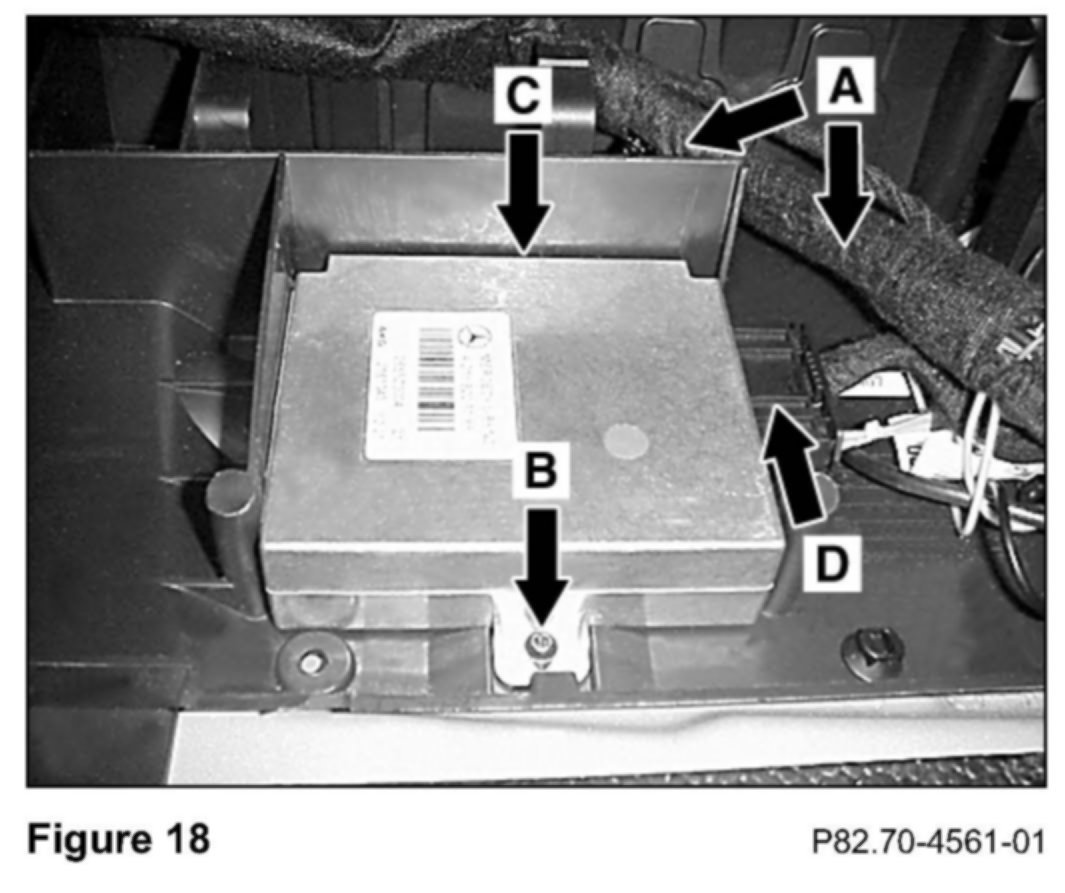 D. Mounting the optional voice control module (VCM)1. Carefully reposition the vehicle harness away from the front of the carrier plate to expose the fastening point of the AKG control module (A, Figure 18-shows harness repositioned).