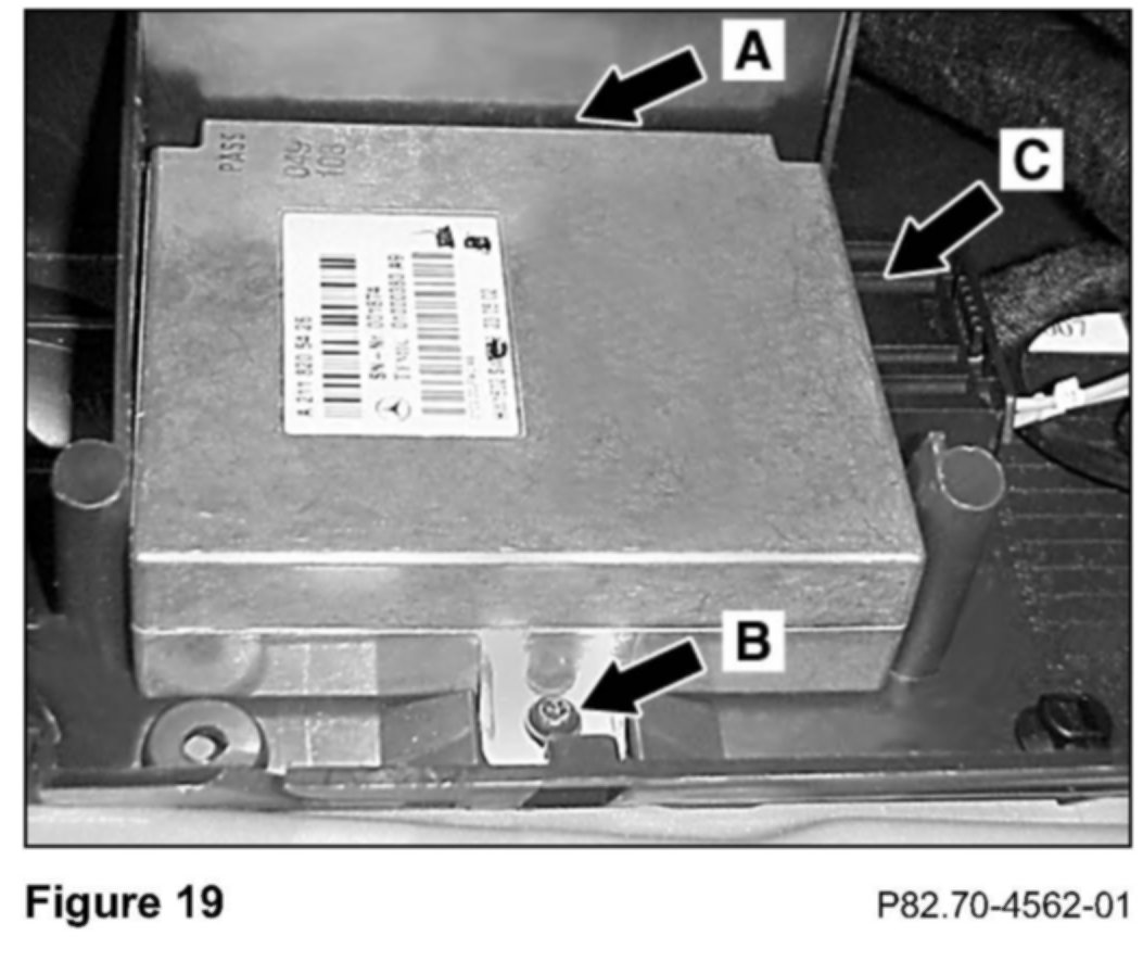 2. Remove the AKG control module from the left compartment of the carrier plate by removing the T10 Torx screw (B, Figure 18) and then sliding the rear mounting-tab (C, Figure 18-not visible in photo) out of the slot.