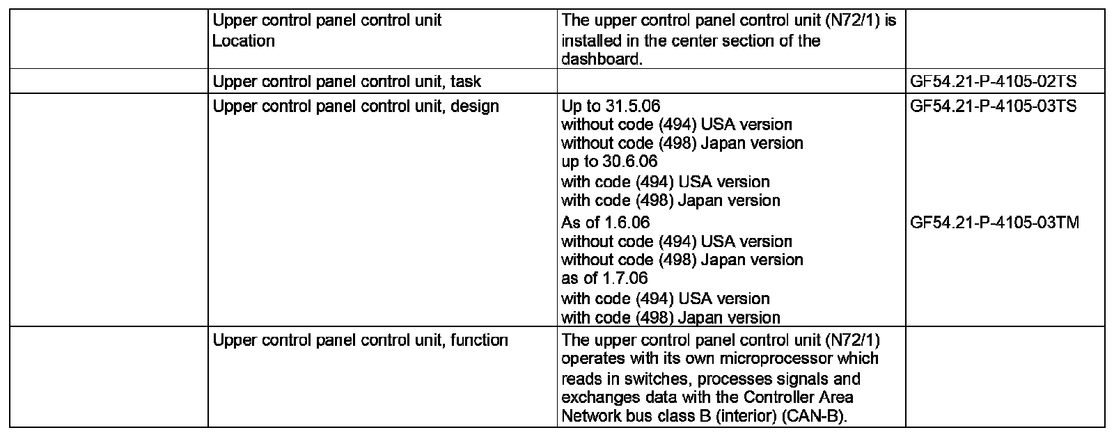 GF54.21-P-4105TS Upper Control Panel Control Unit, Location / Task / Design / Function