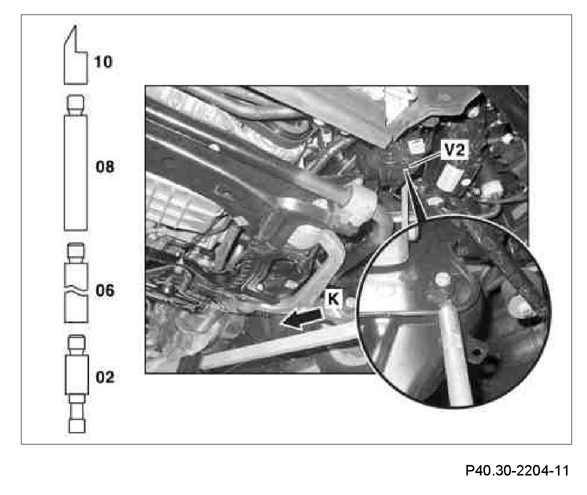 1 Measure comparative measurement (V1) from the check point (K) to the bolted connection of the suspension strut on the lower transverse control arm. Measure on the left and right side in each case.