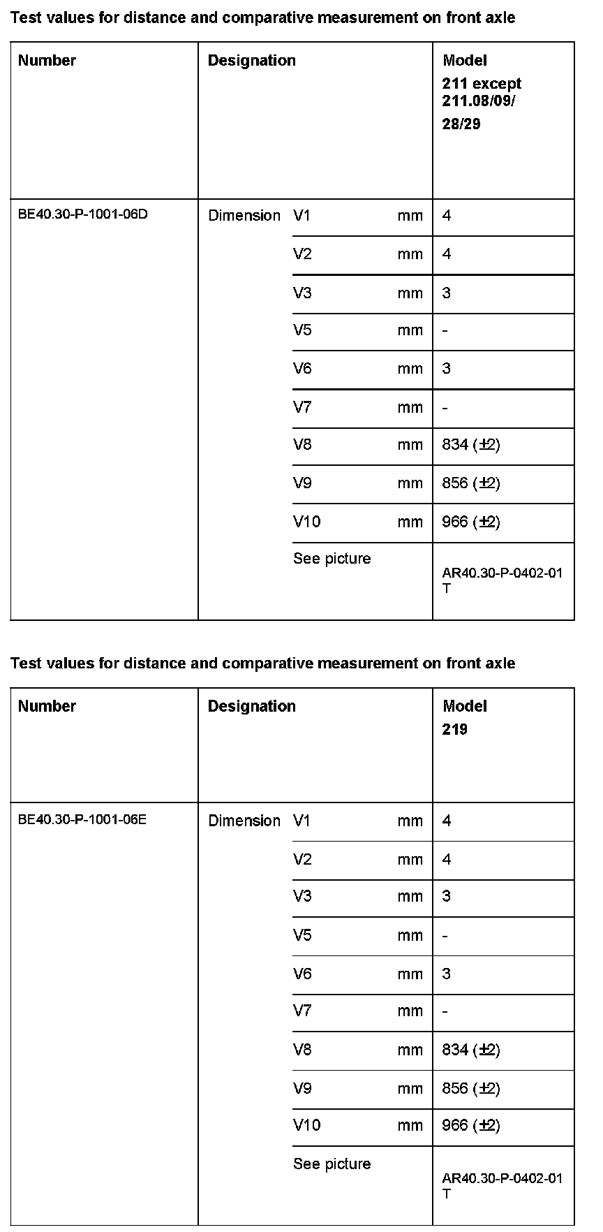 Test Values For Distance And Comparative Measurement On Front Axle:
