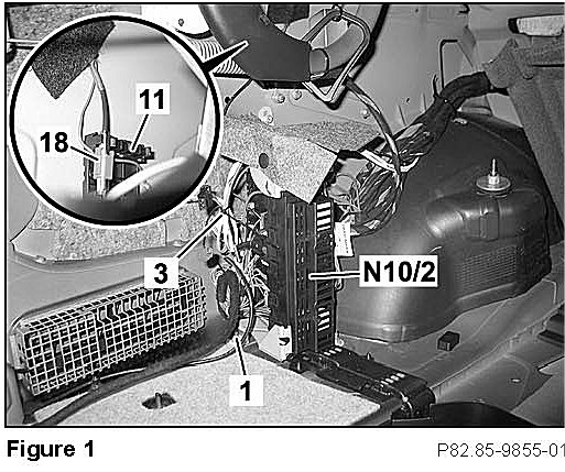 2. Configure fiber optic cable leads (arrows, Figure 9) into MOST ring: