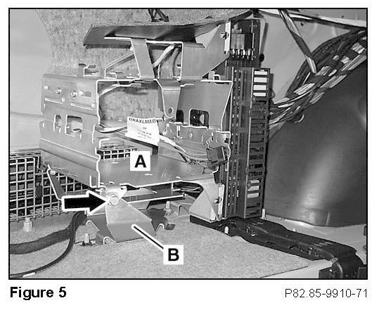 ^ Secure processor mounting bracket (A, Figure 5) to base bracket (B) with bolt (arrow).