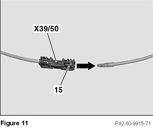^ Press fiber optic cable connector locking tab (15, Figure 11) outwards slightly and pull fiber optic cable lead out of connector (X39/50) in direction of arrow (Figure 11).