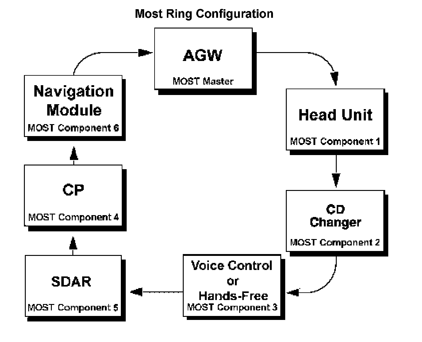 The diagram is an example of a MOST ring configuration including all components. Some installations will not include all the components shown in the example. If a component is not present, connect the preceding component to the component following the one not present.