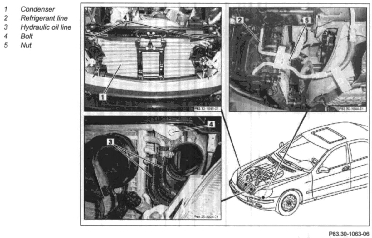 4 Remove nut (5) from connection of pressure/hot gas line on condenser