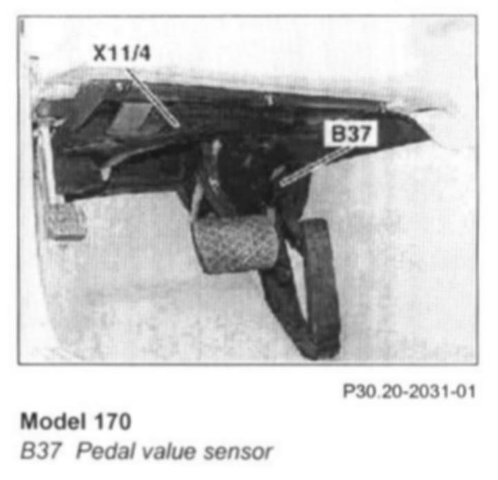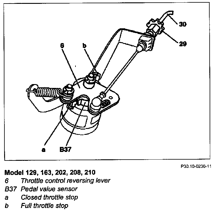 - Model 129, 163, 202, 208, 210: Check if the relay lever sit close to the closed throttle stop of the pedal value sensor. In the event of a complaint: