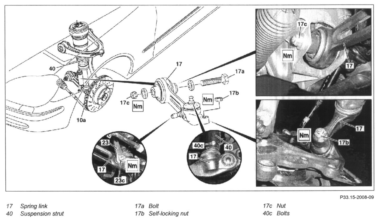 NOTE: Installation: Screw the nut (17c) onto the bolt (17a) until it makes contact, but refrain from tightening it to allow the rubber mount of the transverse control arm to twist during spring compression. Tighten nut (17c) only once the vehicle is ready to drive.