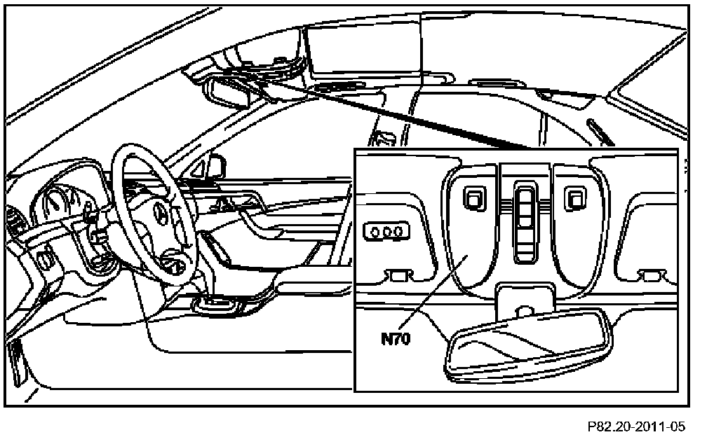The overhead control panel control unit (N70) is located in the roof area of the inside rearview mirror.