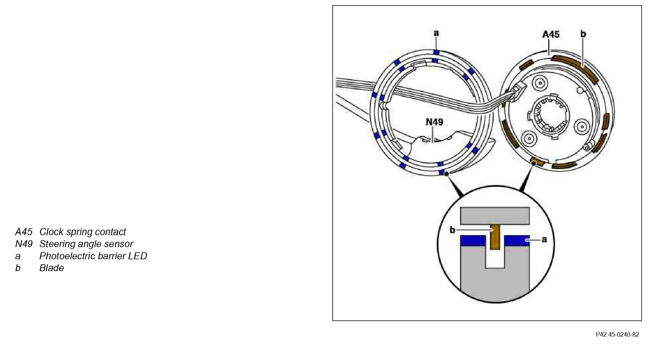 Digital sensor with 9 light-emitting diodes (a) for photoelectric barrier measurement. The steering angle sensor consists of 2 microprocessors forming a single unit together with one signal ring. The signal ring accommodates the 9 light-emitting diodes (a) at equal intervals. These are located in a photoelectric barrier duct which is traversed by 8 blades (b) of various lengths. The photoelectric barriers are located in the upper part of the contact spiral (A45) and the two components must be assembled (clipped together) to form the complete functional unit of the optical steering angle sensor (N49).