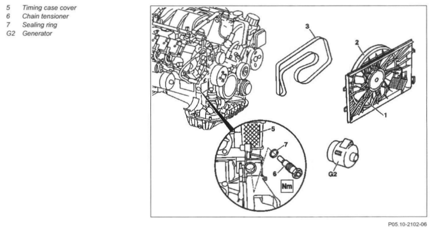 10 Take chain tensioner (6) off timing case cover (5)