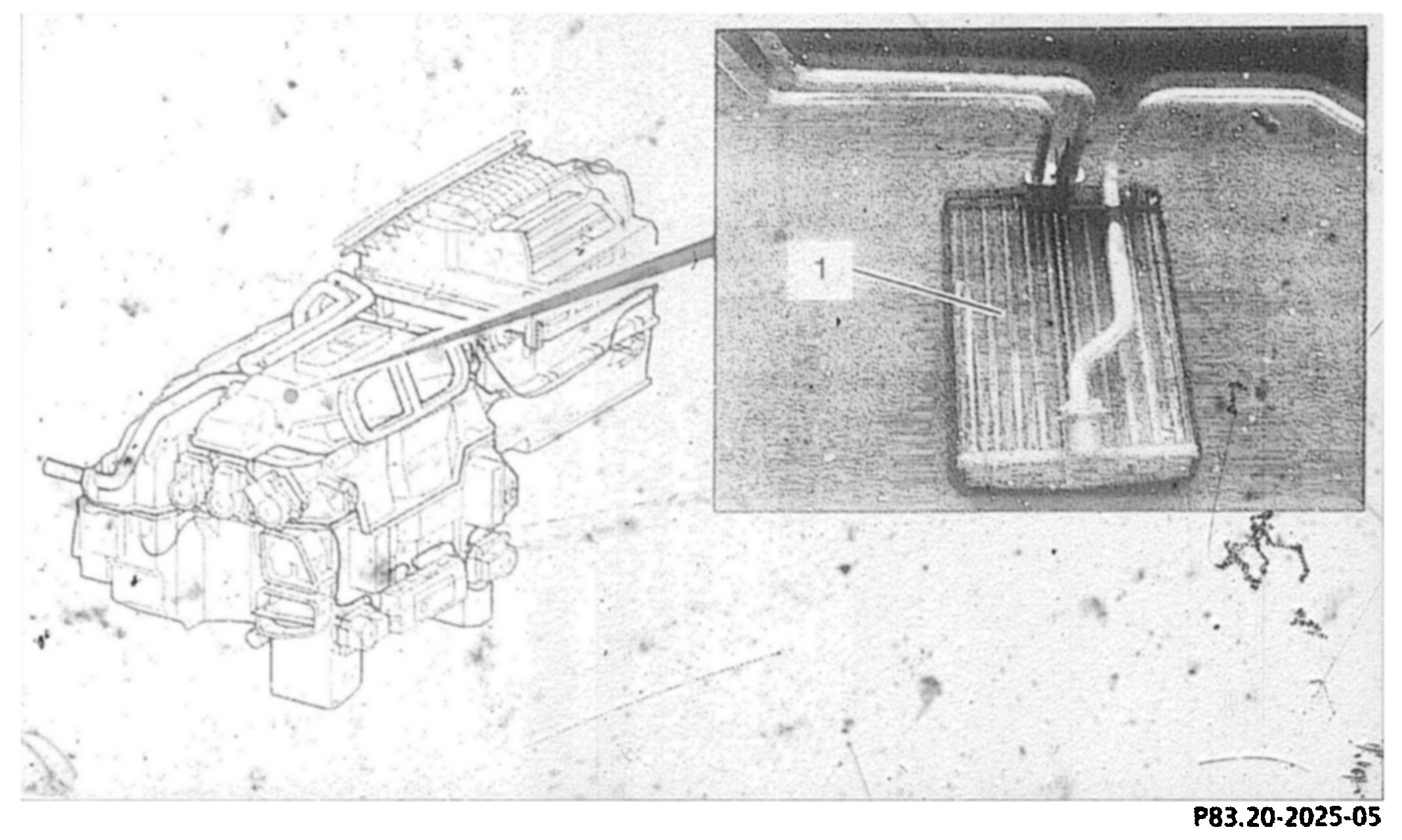 The heater core (1) is located behind the instrument panel in the A/C housing.