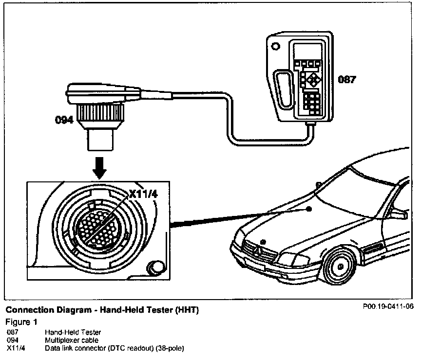 1. Connect HHT with test cable to data link connector (X11/4), readout DTC fault codes.