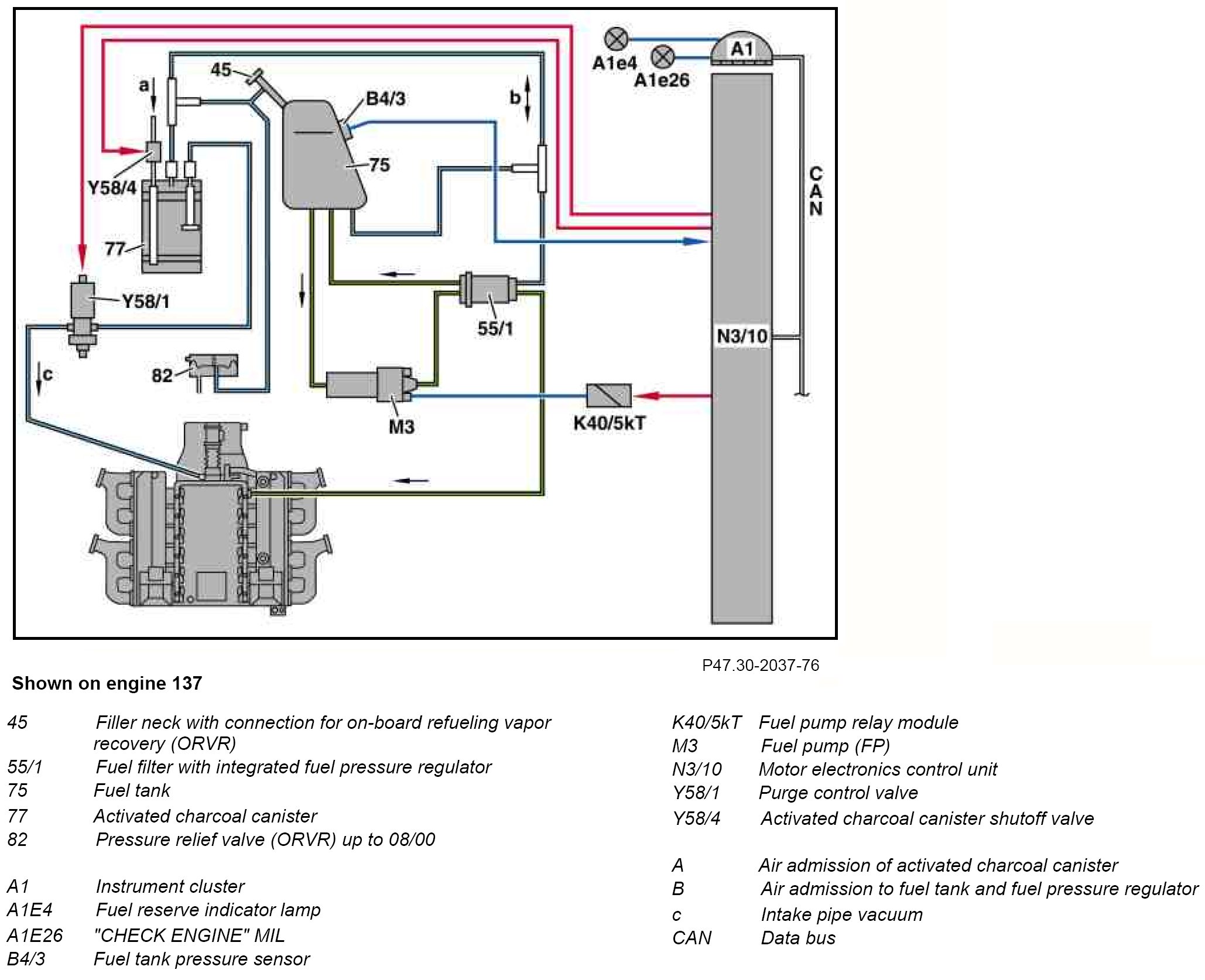 The activated charcoal canister shut-off valve (Y58/4) is closed and the purge control valve (Y58/1) opened. The vacuum in the intake manifold (c) reaches the fuel tank (75). As a result, a vacuum builds up in the fuel tank.