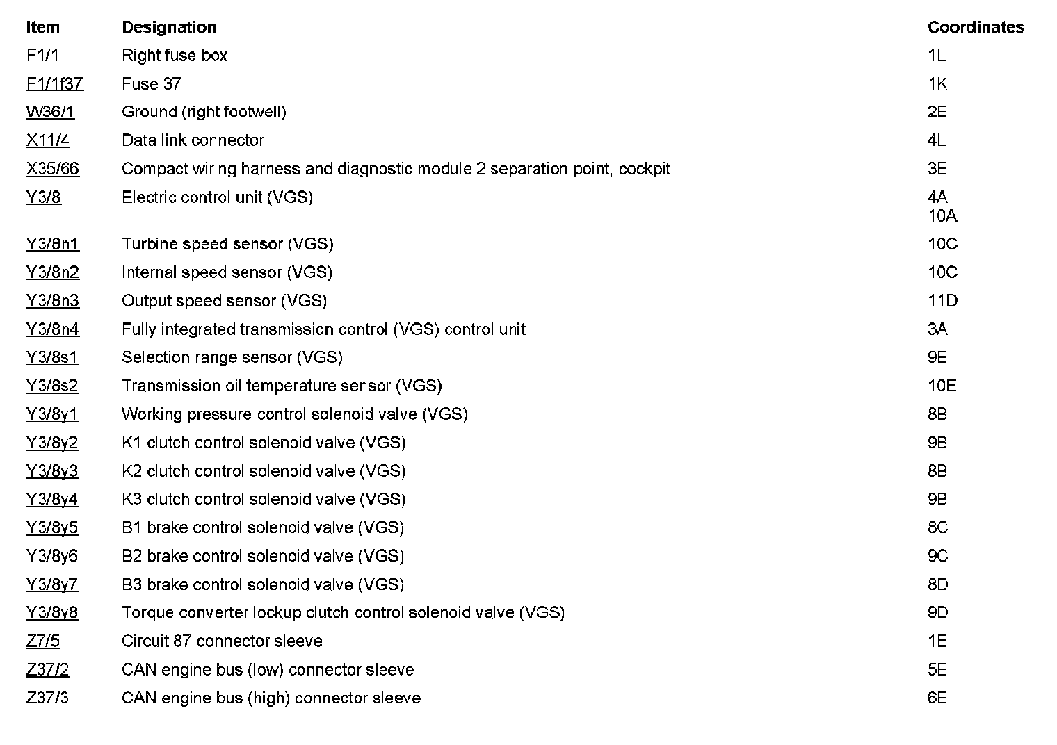 Component Description/Coordinates, F1/1 to Z37/3: