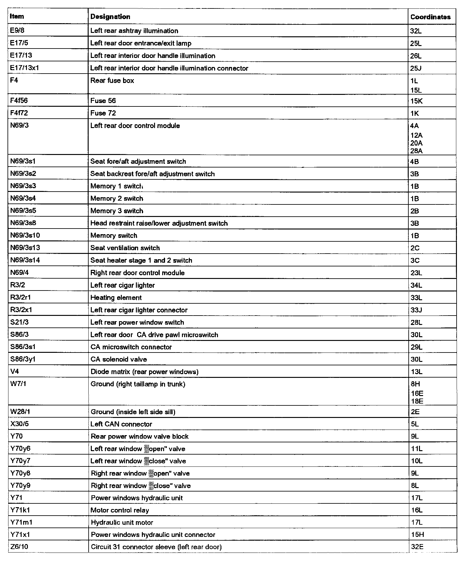Legend For Door Control Module (DCM), Rear Left: