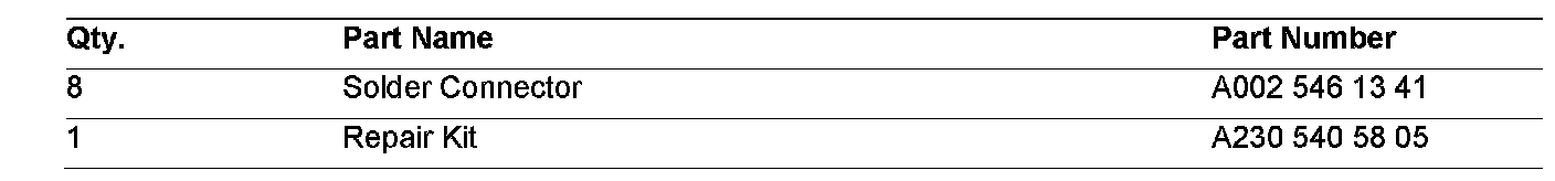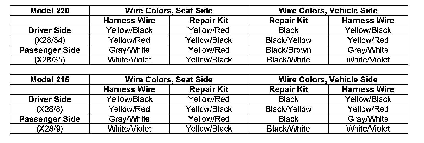 If you receive customer reports in the above model vehicles that the SRS light is illuminated and diagnostic fault code(s) B9183 and/or B91A3 are stored in the SRS ECU, the resistance of the circuit for the belt buckle tensioner squib may be too high. On Model 215, this high resistance may be caused by a malfunction in the seat belt ETR connector/left seat separation point (X28/8) or the seat belt ETR connector/right seat separation point (X28/9). On Model 220, this high resistance may be caused by a malfunction in the driver's seat buckle ETR connector separation point (X28/34) or the passenger seat buckle ETR connector separation point (X28/35). The malfunctioning connectors must be replaced with a repair kit. Please follow the below procedure to repair.