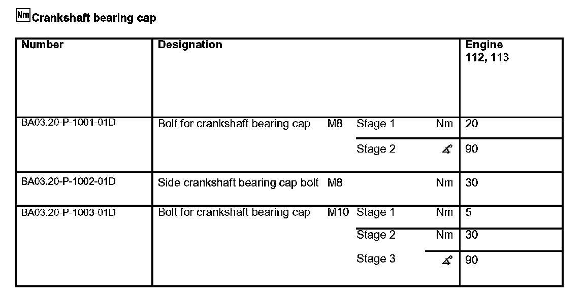 Assignment of crankshaft bearing shell bottom halves (bearing cap) M 112, 113: