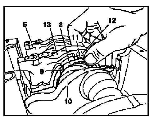 Installation: When installing the fit bearing cap (13), hold both thrust plates (8) tight. The anti-twist locks (11) of the thrust plates (8) must be located in the slots (12) of the fit bearing cap (13). The oil grooves (9) of the thrust plates (8) must point toward the crank webs (10).