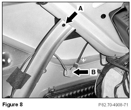 2. In the upper area of the left quarter panel, make sure the hole in the vertical support beam is clear (i.e. nothing wire-tied to it or blocking it) (A, Figure 8).