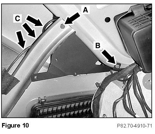 6. Mount the compensator bracket assembly to the upper area of the left quarter panel with a 10-mm machine screw at the top (A, Figure 10) and an 8-mm self-tapping screw at the bottom, right (B, Figure 10).