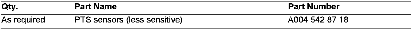 If you receive customer reports in the above model vehicles of Parktronic (PTS) triggering without any obvious cause, the front PTS sensors may be reacting too sensitively. New front sensors are available which are less sensitive and should be installed per the below procedure. The front PTS sensors and locations are: