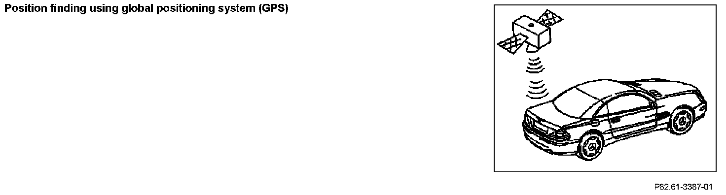 The GPS is a satellite-supported localizing system installed by the American Department of Defense. It is a toll-free service available throughout the world. Various GPS satellites constantly transmit time and position data. 4 satellites are needed for the first position calculation, then 3 receivable satellites are sufficient. GPS position finding is irreplaceable for journeys outside the digitized map area and after vehicle transport (e.g. train or ferry journeys and towing). A new GPS position (after interruption of the satellite reception) can take several minutes (up to 20 minutes when the equipment is first set up).