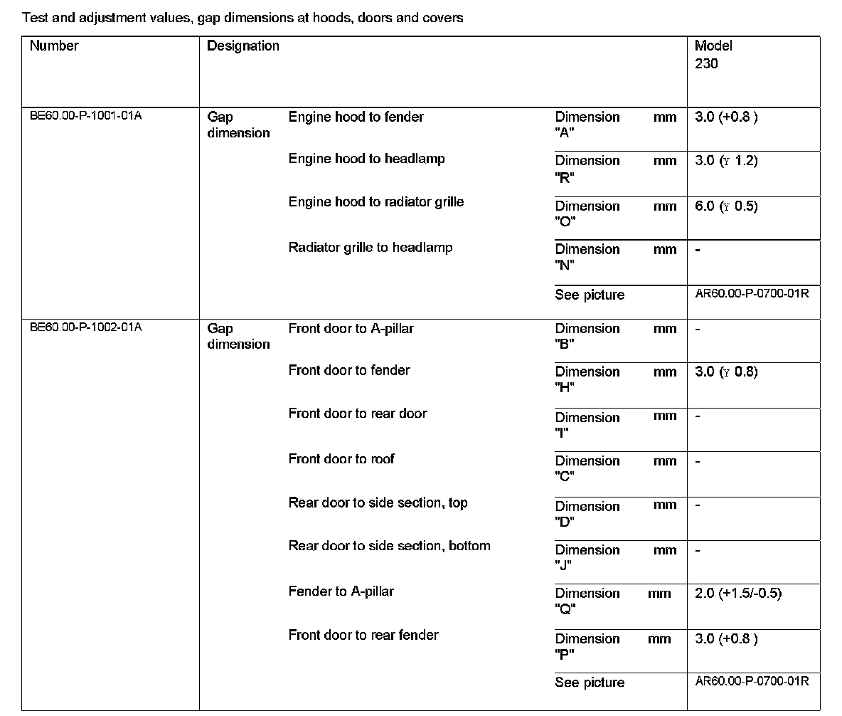 Test And Adjustment Values, Gap Dimensions At Hoods, Doors And Covers: