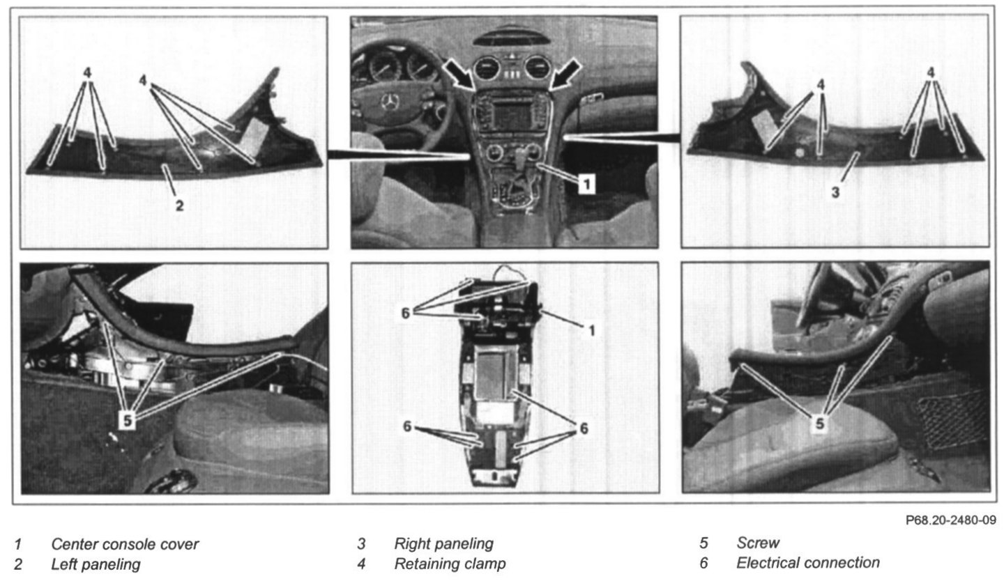 8 Disconnect connectors from electrical connections (6) and remove center console cover (1)