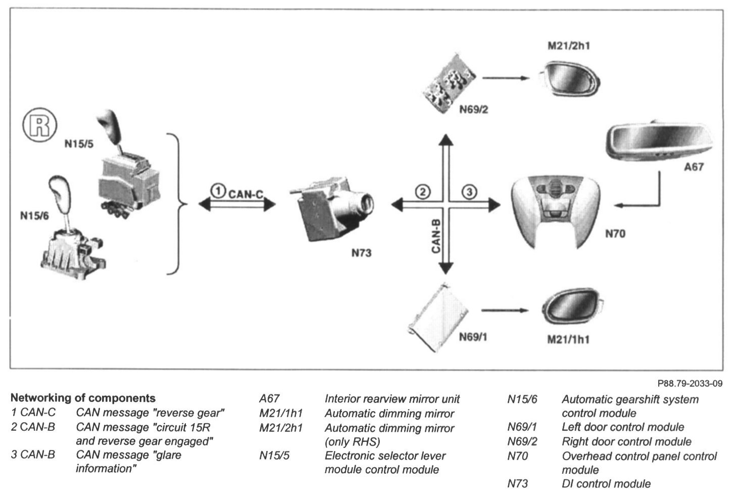 The two input parameters are detected by the mirror dimming forward sensor (A67h1) in the mirror housing (rear) and by the mirror dimming to rear sensor (A67h2) in the mirror lens of the inside rearview mirror unit (A67). The inside rearview mirror unit (A67) supplies dimming information to the overhead control panel control module (N70) and transmits this as a CAN message to the left door control module (N69/1). The left door control module (N69/1) controls the actuation voltage accordingly for dimming the driver-side mirror.