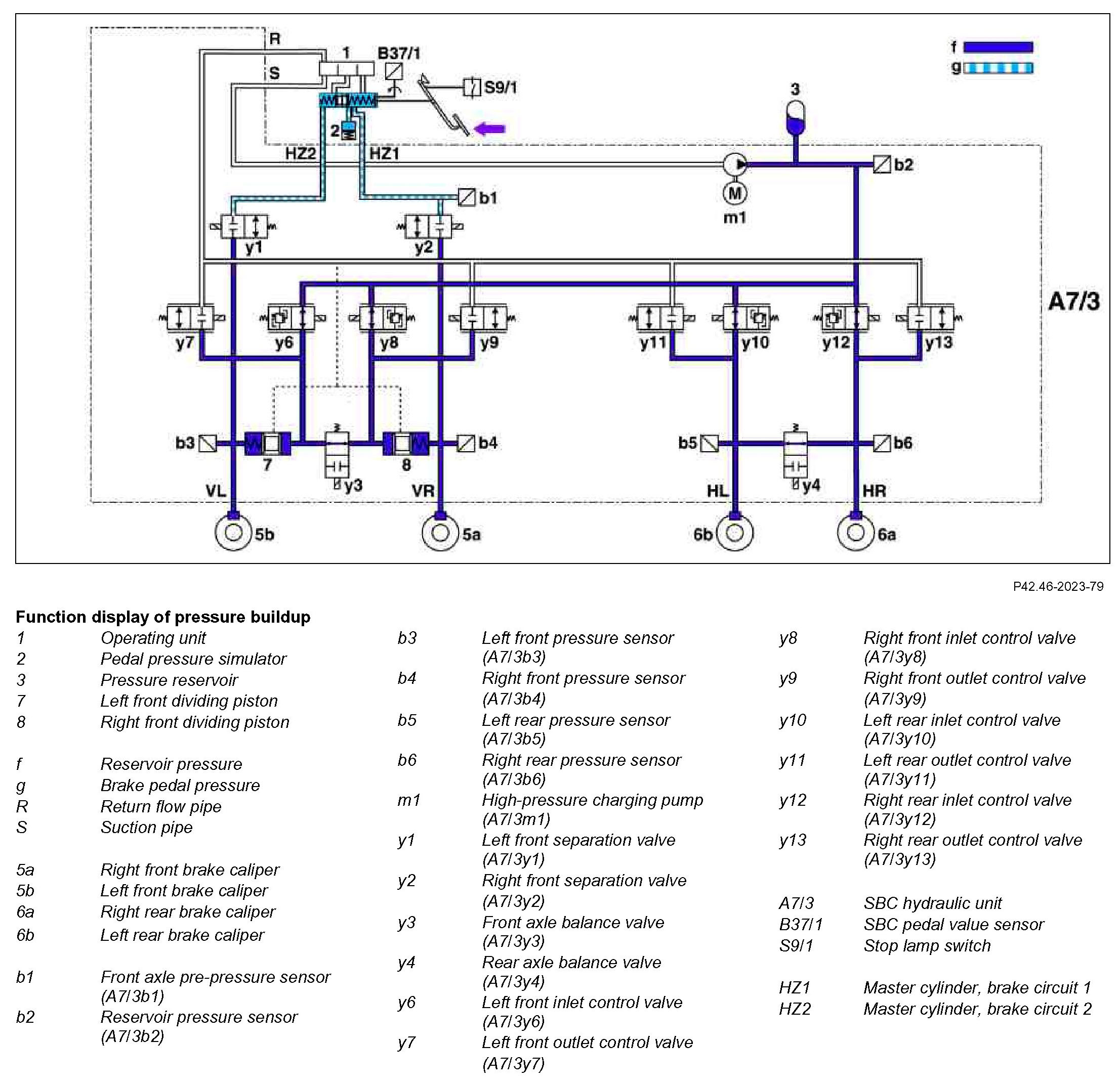 The ESP, SPS [PML] and BAS control unit (N47-5) calculates the brake pressure. The specified data are passed on to the SBC control unit (A7/3n1) and this starts with the control in the SBC hydraulic unit (A7/3).