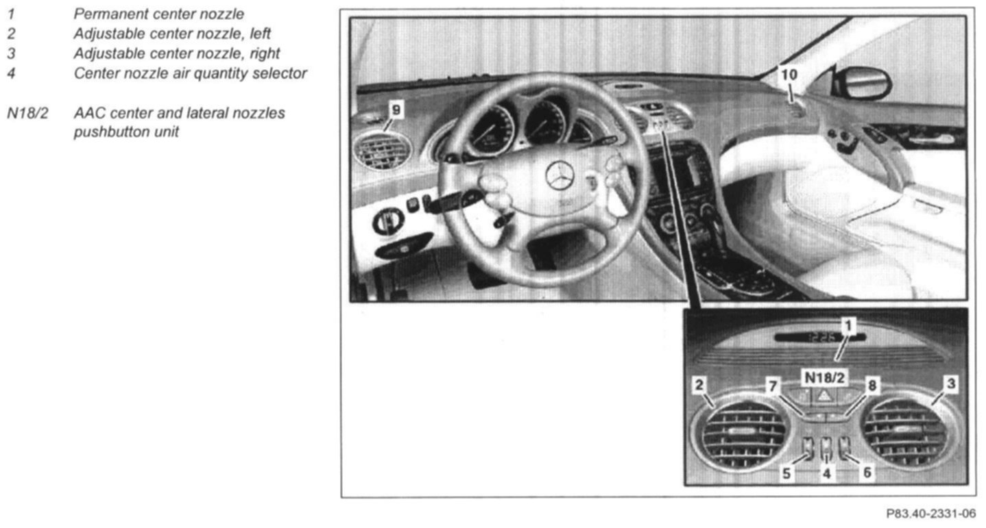 The fixed center nozzle (1) is located at the center of the instrument panel. The adjustable center nozzles (2, 3) are integrated into the AAC center and lateral nozzles pushbutton unit (N18/2).