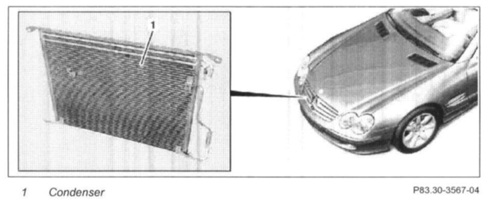 The condenser (1) is located behind the radiator grille directly in front of the radiator.