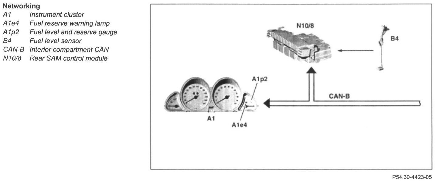 - The instrument cluster (A1) registers this percentage from the interior compartment CAN and actuates the fuel level and reserve gauge (A1p2), and the fuel reserve warning lamp (A1e4) if necessary.