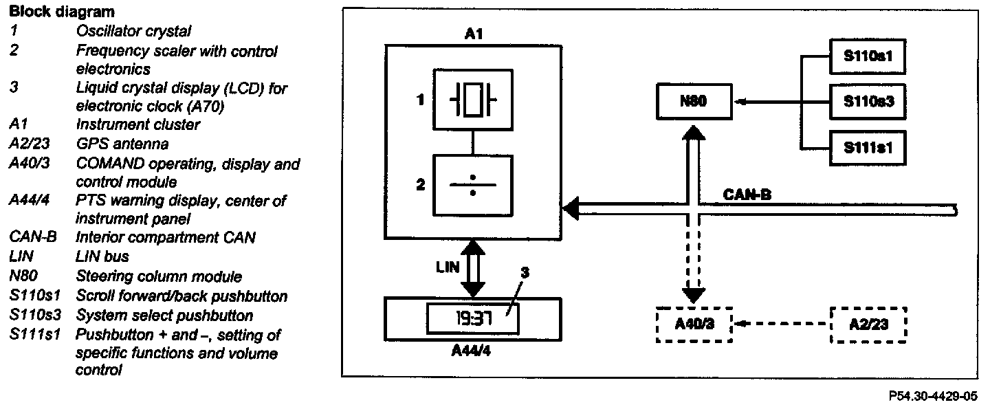The liquid crystal display (LCD) for the electronic clock (A70) is located in the front PTS warning display in the center of the instrument panel (A44/4). This is connected to the instrument cluster (A1) via a serial interface (LIN bus; LIN=Local interconnect Network).